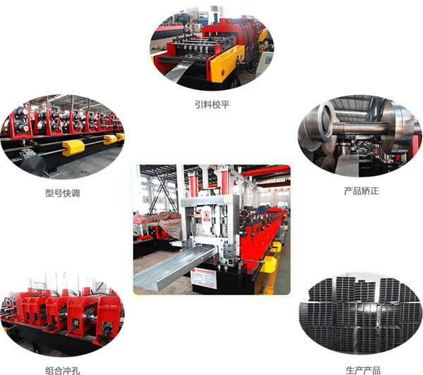 工藝流程: 開卷—導(dǎo)向進(jìn)料—平板校平—輥壓成型—液壓沖孔—定尺切斷—托板出料