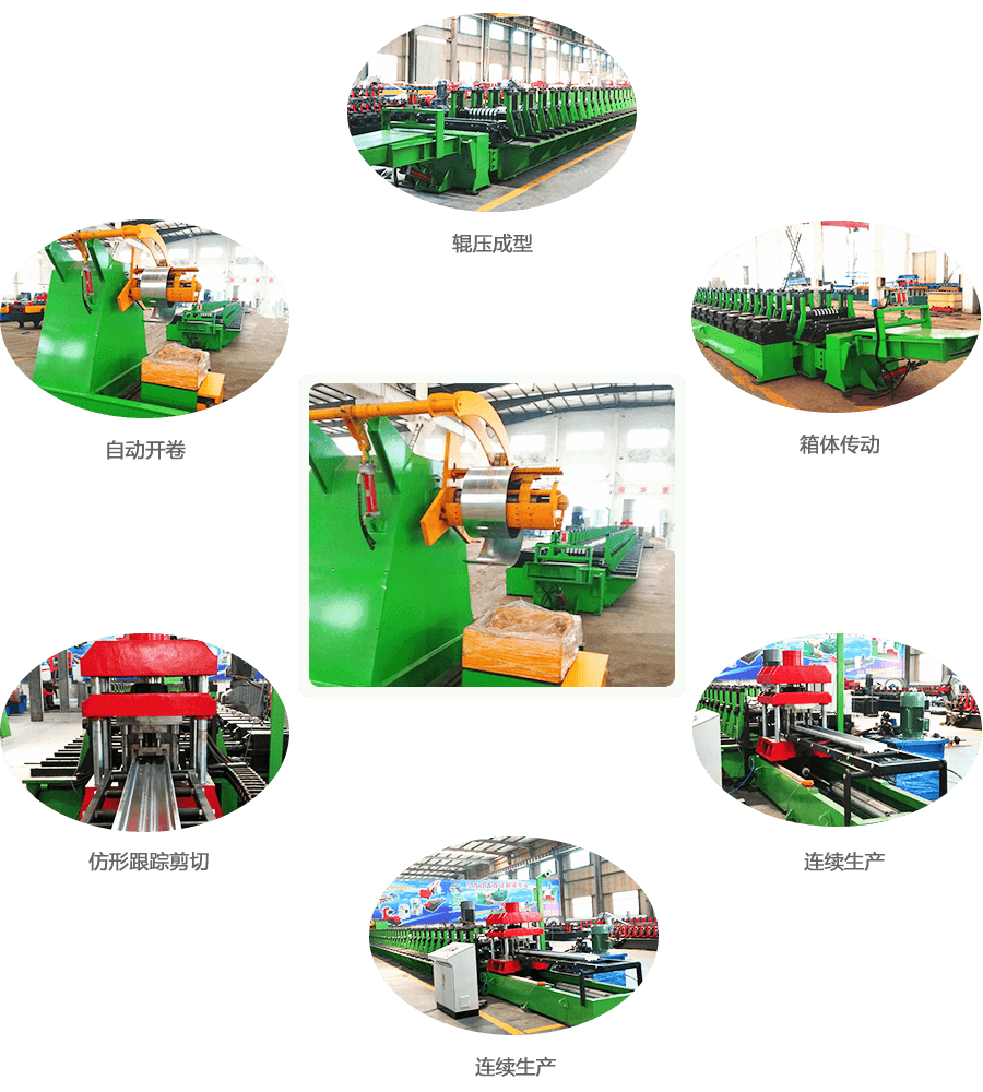 液壓自動(dòng)開(kāi)卷→引料裝置→校平→輥壓成型→機(jī)械跟蹤沖孔切斷→托料出板